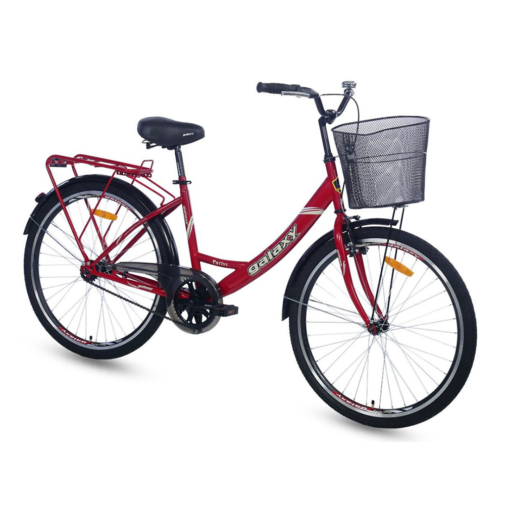 PARISS 26″ je klasičan gradski bicikl sa zadnjom kontra kočnicom. Odlikuje ga čvrst čelični ram, udobno široko sedište i klasičan elegantan dizajn. Na volanu se nala ze zvonce i metalna korpa, a na zadnjem točku i praktičan pak treger.