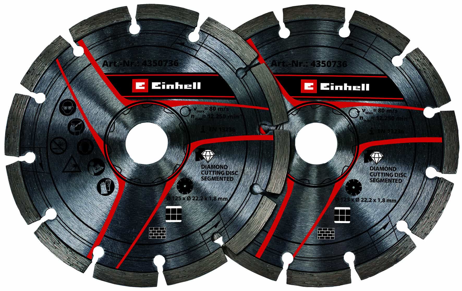 Originalni Einhell dijamantski set diskova za sečenje 125 mm je praktičan dodatak za zidne sekače. Dve dijamantske ploče za sečenje se koriste u kombinaciji sa rezačem žlebova za zid za snažno glodanje utora i žlebova u zidu. Posebno su pogodni za glodanje kamena, betona, pločica, keramike, porcelanskog kamena, mermera i granita. Zahvaljujući svom otvoru od 22,2 mm, dijamantski diskovi za sečenje se mogu koristiti sa Einhell zidnim rezačima TC-MA 1300 i TE-MA 1500, ali se mogu montirati i na uređaje drugih proizvođača. Maksimalna brzina za korišćenje Einhell dijamantskih diskova za sečenje je 12.250 o/min. Isporuka uključuje dva dijamantska rezna diska debljine 1,8 mm prečnika 125 mm