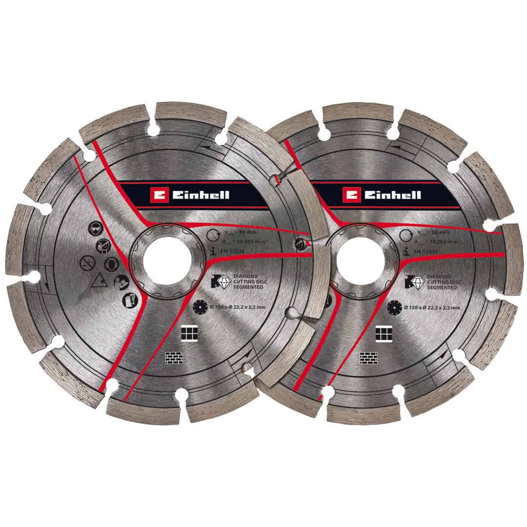 Originalni Einhell dijamantski set diskova za sečenje 150 mm je praktičan dodatak za zidne sekače. Dve dijamantske ploče za sečenje se koriste u kombinaciji sa rezačem žlebova za zid za snažno glodanje utora i žlebova u zidu. Posebno su pogodni za glodanje kamena, betona, pločica, keramike, porcelanskog kamena, mermera i granita. Zahvaljujući svom otvoru od 22,2 mm, dijamantski diskovi za sečenje se mogu koristiti sa Einhell zidnim rezačem TE-MA 1700, ali se mogu montirati i na uređaje drugih proizvođača. Maksimalna brzina za korišćenje Einhell dijamantskih diskova za sečenje je 10.200 o/min. Isporuka uključuje dva dijamantska diska za sečenje debljine 1,8 mm prečnika 150 mm.