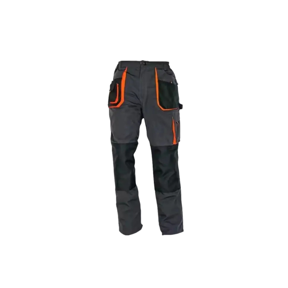 Radne pantalone Thor u broju 62 crno/narandzaste savremenog dizajna sa brojnim praktičnim džepovima, izradjene od visokokvalitetne tkanine 65% poliester, 35% pamuk, 270 g/m², sa ojačanjima od 600D poliestera na kritičnim mestima. Poseduju džepove za umetanje štitnika za kolena.
