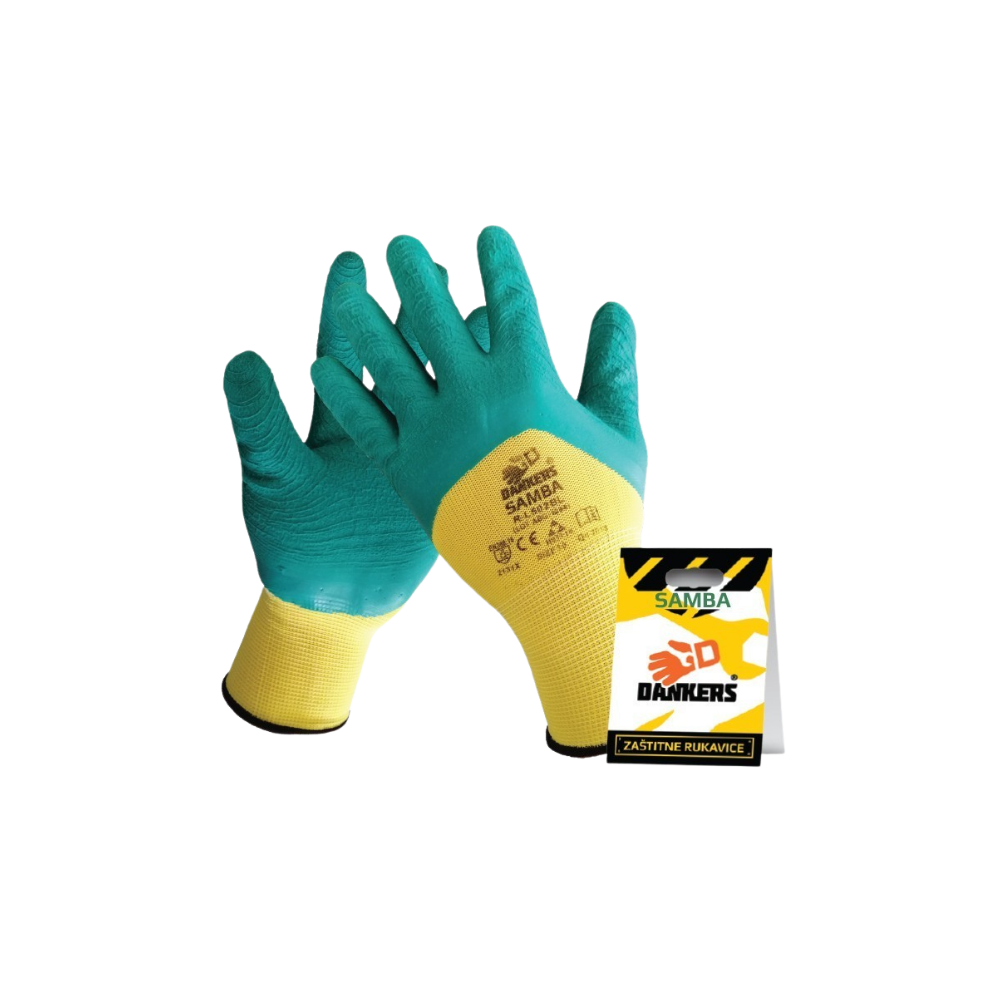 Dankers Samba rukavice izrađene su od bešavnog poliesterskog prediva sa elastičnom manžetnom, dok je dlan prekriven hrapavim lateks premazom za odličan hvat u suvim i vlažnim uslovima. Namenjene su za rad u građevinarstvu, transportu, skladištenju i opštim manuelnim poslovima gde je potrebna otpornost i sigurnost pri radu.